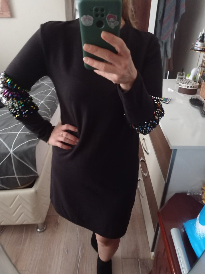 iki kez kullanıldı oldukça rahat ve şık bir model m/l beden uyumlu Boncuk işlemeli kolları ve yuvarlak yaka detayıyla siyah, vücuda oturan midi uzunlukta triko elbise. Parti için uygun goth tarzında.