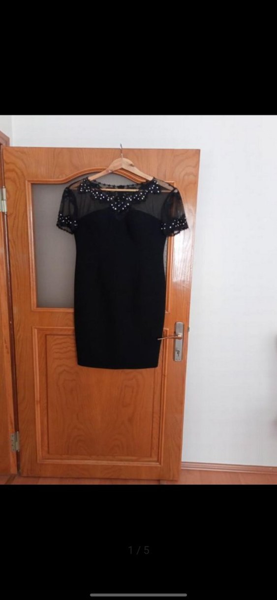 V yaka, kısa kollu, vücuda oturan siyah mini elbise. Yaka ve kollarda boncuk detayları bulunur. Romantik akşamlar için uygundur.