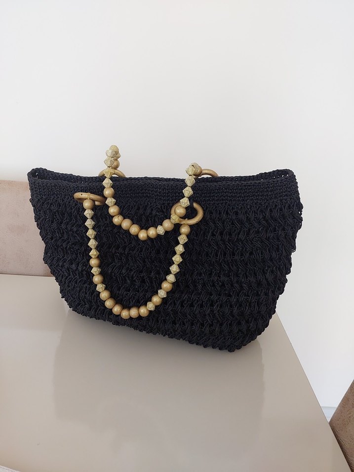 Bu siyah örgü kadın çanta, boncuklu saplarıyla minimalist ve bohem tarzı bir araya getiriyor. Düz yüzeyi sade bir şıklık sunuyor.