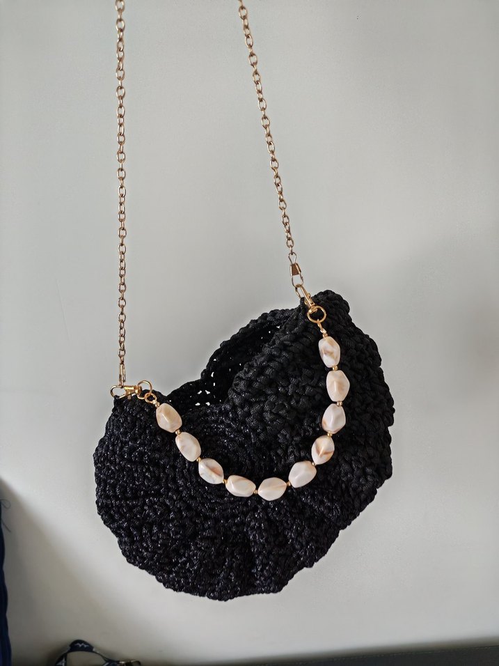 Boncuk detaylı siyah örgü kadın çanta, zincir askılı, modaya uygun ve avant-garde tarzda.