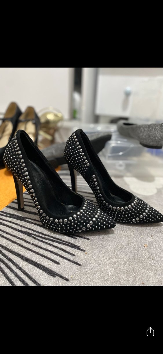 Siyah, boncuk işlemeli desenli stiletto topuklu ayakkabılar, dikkat çekici ve gösterişli parti stilleri için uygundur.