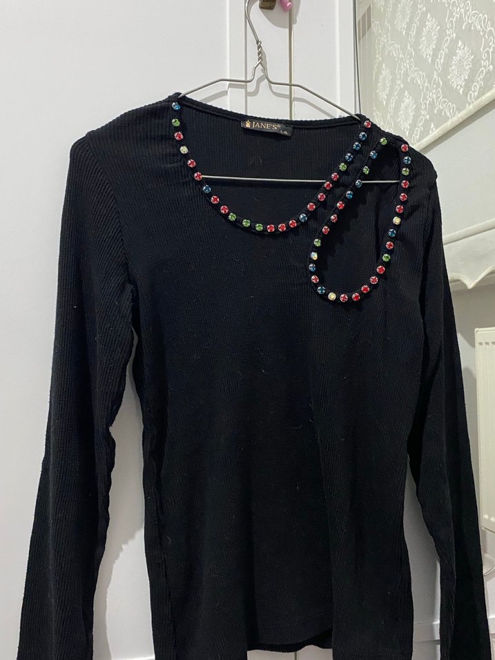 Boncuk işlemeli renkli detaylara sahip, uzun kollu siyah triko bluz. Yaka kısmı collared neck olup, günlük ve goth tarzlara uygundur. Rahat ve şık.