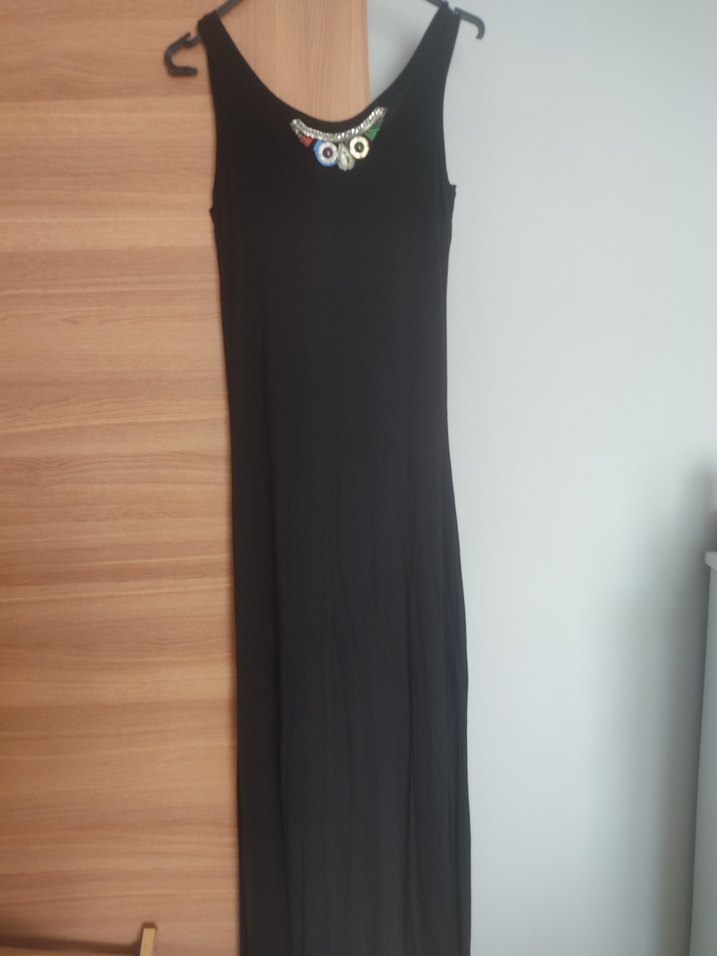 V yaka, boncuk detaylı, kolsuz siyah uzun elbise. Düz kesim ve minimalist stilde, günlük kullanıma uygun.