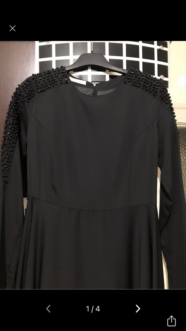 Boncuk işlemeli omuz detaylarıyla siyah, uzun kollu, uzun ve vücuda oturan bu elbise gotik ve modern bir tarz sunar.