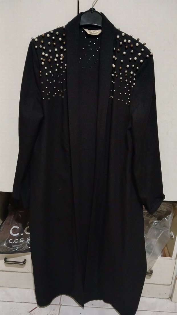 Boncuk Detaylı Siyah Uzun Kadın Kaban