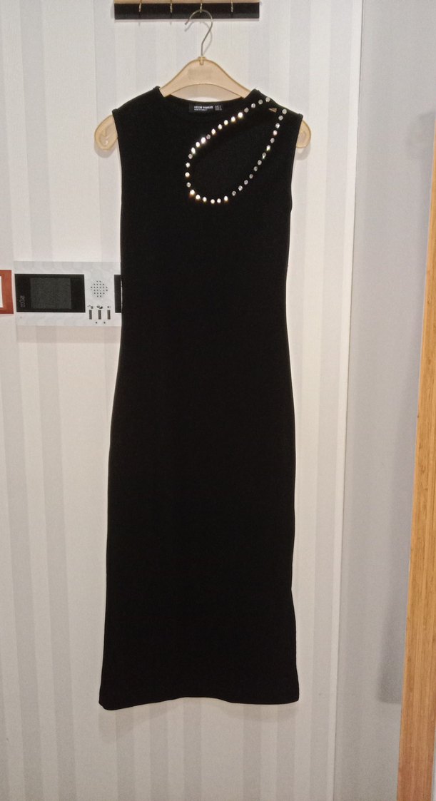 Kolsuz, vücuda oturan siyah triko elbise, yüksek yakalı ve omuzda boncuk detaylıdır. İpeksi dokusu ile minimalist ve gotik tarz sunar.
