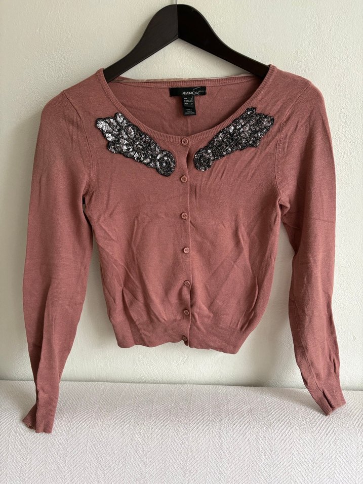 Boncuk Detayli Triko Hırka Gul kurusu renkli, düğmeli ve nakışlı detaylara sahip triko hırka. Uzun kollu, bisiklet yakalı ve vücuda oturan kesimdedir. #mango