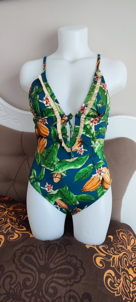 Boncuk detaylı, renkli desenli, turkuaz tonlarında, askılı ve bohem tarzda, vücuda oturan mayo. Plaj için uygun.