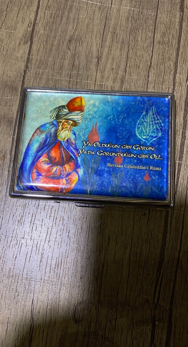 Boncuk detaylı, turkuaz renkte, baskılı erkek kartlık. Mevlia Celcddini Rumi yazılı, bohem ve karşı kültür tarzında.