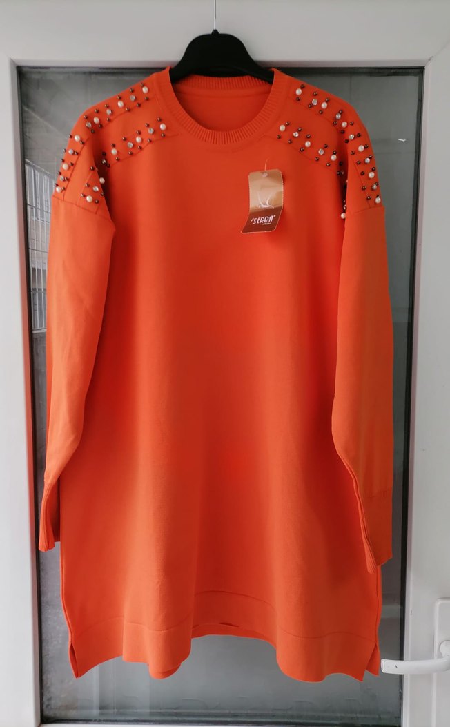 Uzun kollu, yuvarlak yakalı ve bol kesim turuncu tunik. Omuzlarda boncuk detayları bulunur. Yumuşak ve sıcak dokulu kumaştan, günlük kullanım için uygundur. ürün likralı esnek triko 42 ve 44 beden uyumlu