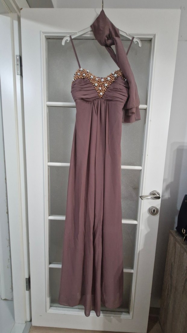 Boncuk Detaylı Uzun Askılı Abiye Elbise
