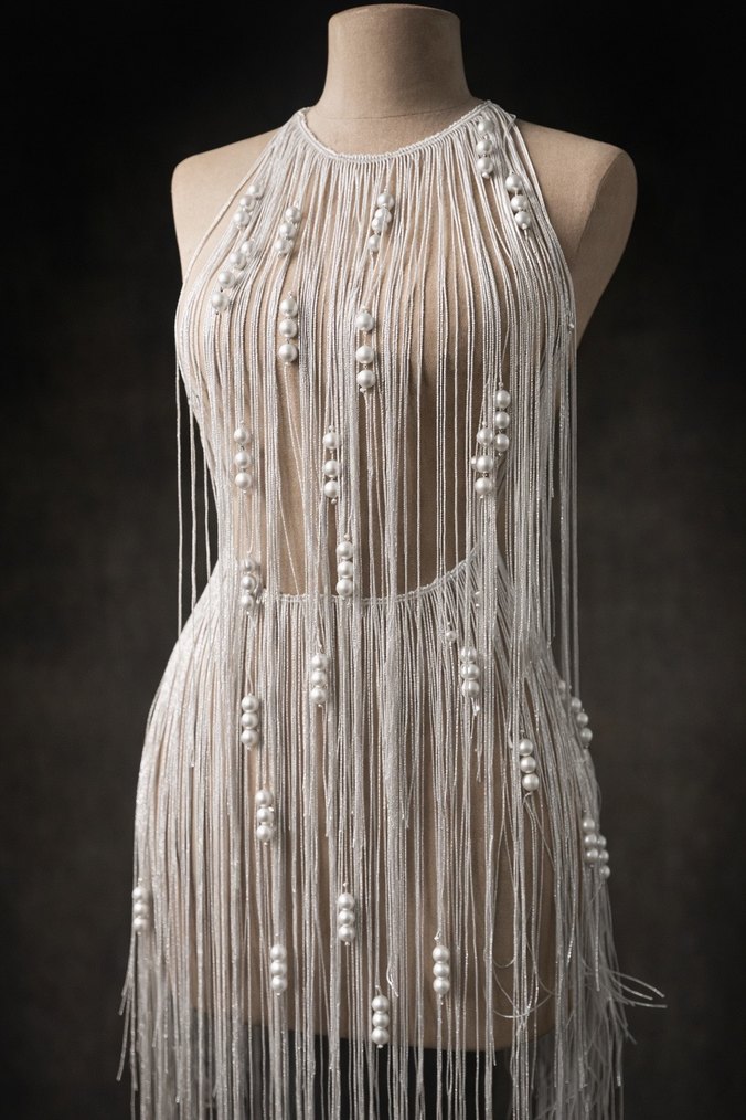 Boncuk işlemeli, uzun püsküllü, halter yaka fantezi kıyafeti alt üst takımdır 42-52 beden uyumludur