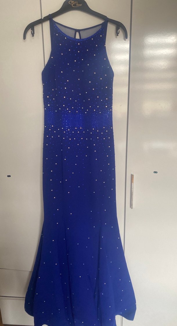 Boncuk işlemeli, Sırt dekolteli,uzun ve balık kesim mavi abiye elbise. Yüksek yakalı ve ince askılı tasarımıyla düğünler için şık ve çağdaş bir seçenek. Başkasıyla pişti olma ihtimali yok.Ekol den alındı.38 beden,36 ya da uygun.160 boyda kuyruklu duruyor.1 kere giyildi.