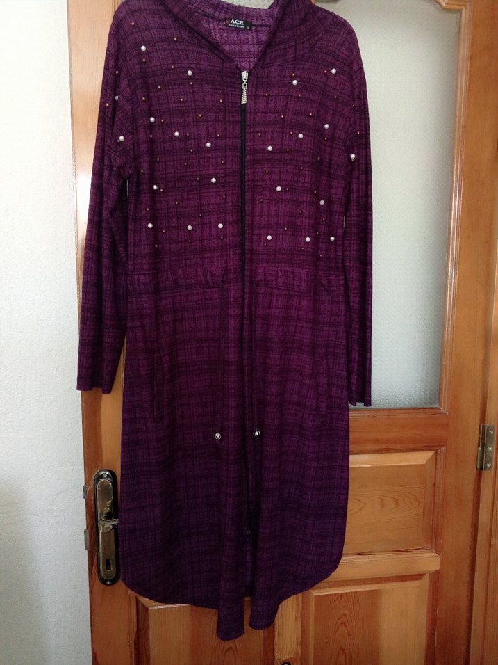 Boncuk detaylı, uzun ve bol kesim mor kadın tunik. Notlu kruvaze yaka ve uzun kollu, rahat ve parlak dokuma kumaştan yapılmıştır.