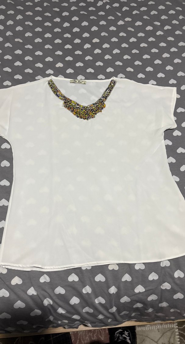 Boncuk detaylı renkli V yaka, kısa kollu, bol kesim, ipeksi dokulu bohem tarzı kadın bluz. Günlük kullanıma uygundur.