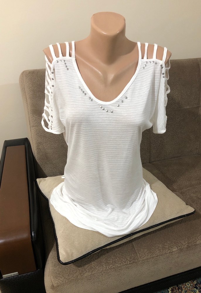 Boncuk detaylı, V yakalı, kısa kollu beyaz örgü bluz. Omuzlarında kesik detaylar bulunan, rahat ve hafif yapıda, günlük kullanıma uygun.
