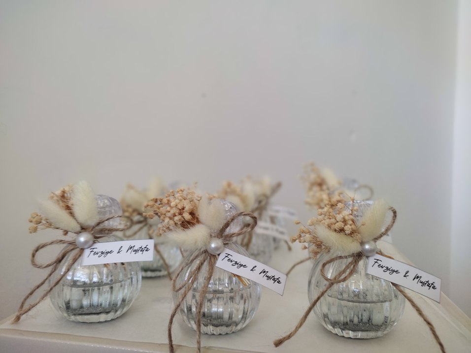 Boncuk ve sim detaylı beyaz vintage cam hediyelikler, kuru çiçek ve ip süslemeleriyle klasik şıklık sunar. 25 adettir. Yazılar çıkartılabilir.