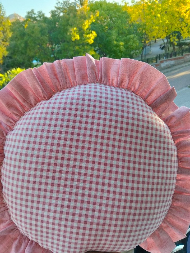 Pastel pembe kareli desene ve fırfırlı kenara sahip yuvarlak yastık, yumuşak ve rahat bir dokunuş sunar. Nazik bir dekoratif vurgu için uygundur. ŞU AN İÇİN 2 RENK MEVCUTTUR... İSTER KARE...İSTER DİKDÖRTGEN... İSTERSENİZ YUVARLAK...