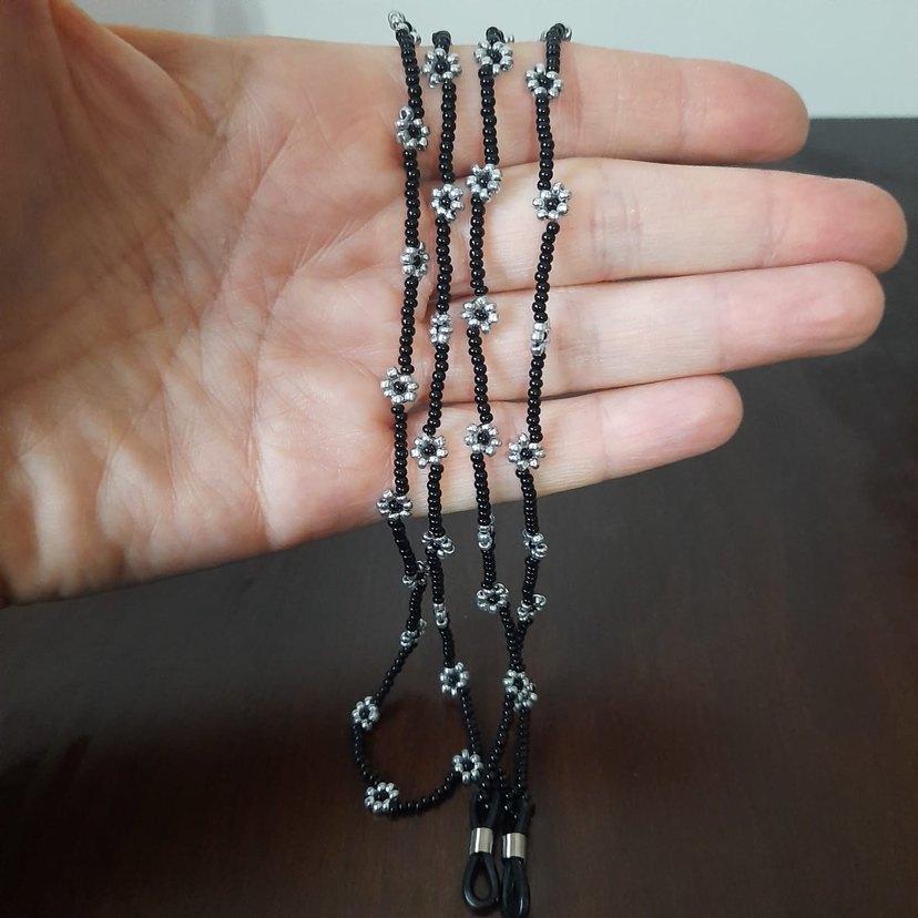 Küçük boncuklarla siyah boncuklu gözlük ipi kullanım için uygun, gotik ve minimalist tarzda. el emeği