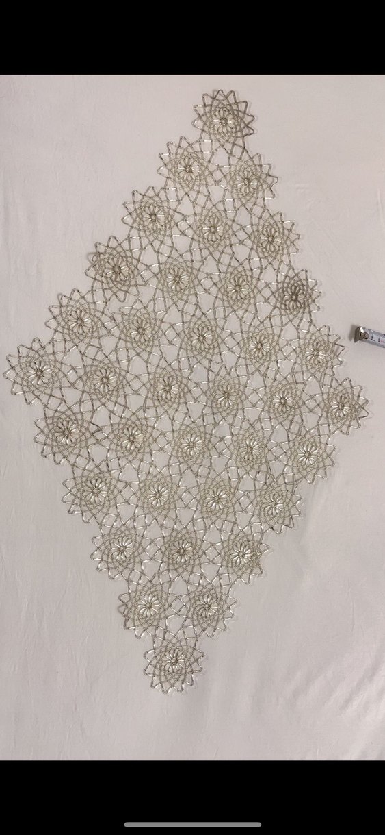 Boncuk işi dantel masa örtüsü, ince ipliklerle yapılmış, çiçek desenli ve elmas şeklinde motiflerden oluşur. Klasik ve zarif bir görünüme sahiptir. Cam boncuk ve mumlu ip tercih edildi. Kusuru yok. Ölçüsünü paylaştım.
