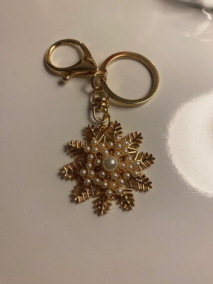 Parlak altın renkli, boncuk işlemeli kar tanesi şeklinde vintage bohem tarzında kadın anahtarlık. Klasik şıklık ve detayları bir arada sunar. ❄️