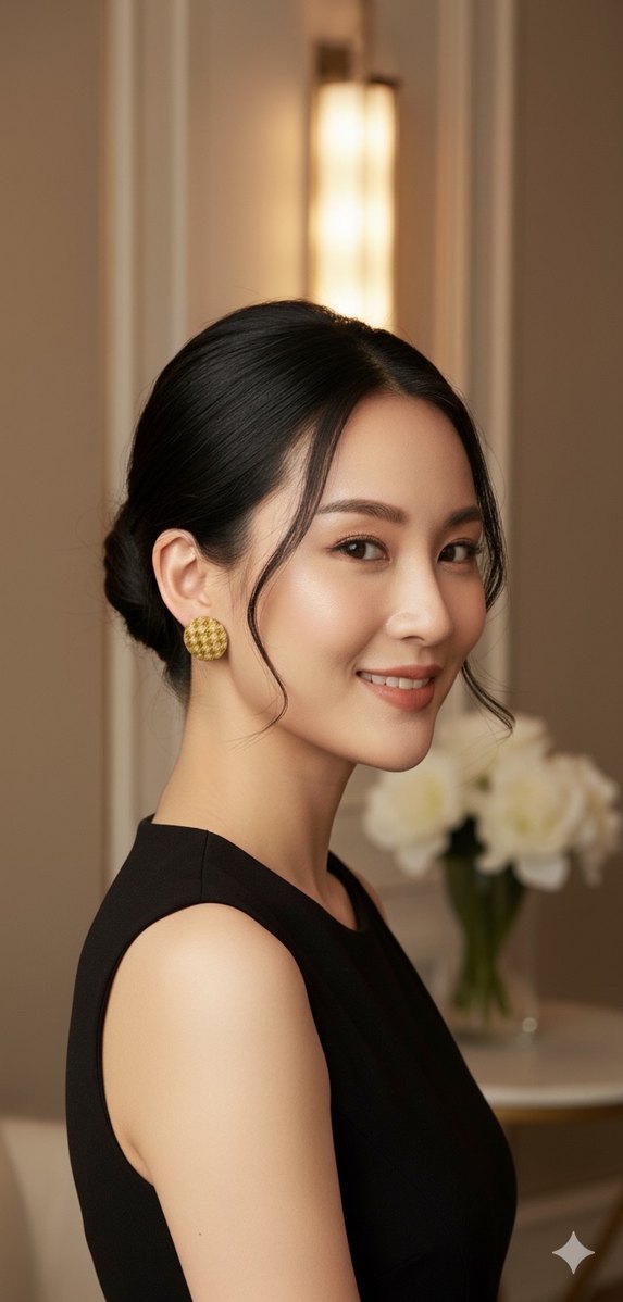 Parlak altın renkli, boncuk işlemeli etnik desenli midi küpeler, düğünler için klasik bir şıklık sunar.