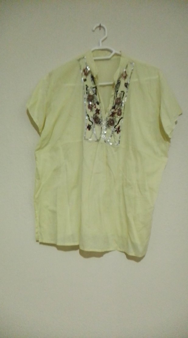 Kısa kollu, V yaka ve bol kesim bej bluz. Boncuk işlemeli nakış detaylarıyla bohem tarzı yansıtır. Yumuşak dokulu kumaştan, günlük kullanıma uygun.en 56 cm boy 65 cm