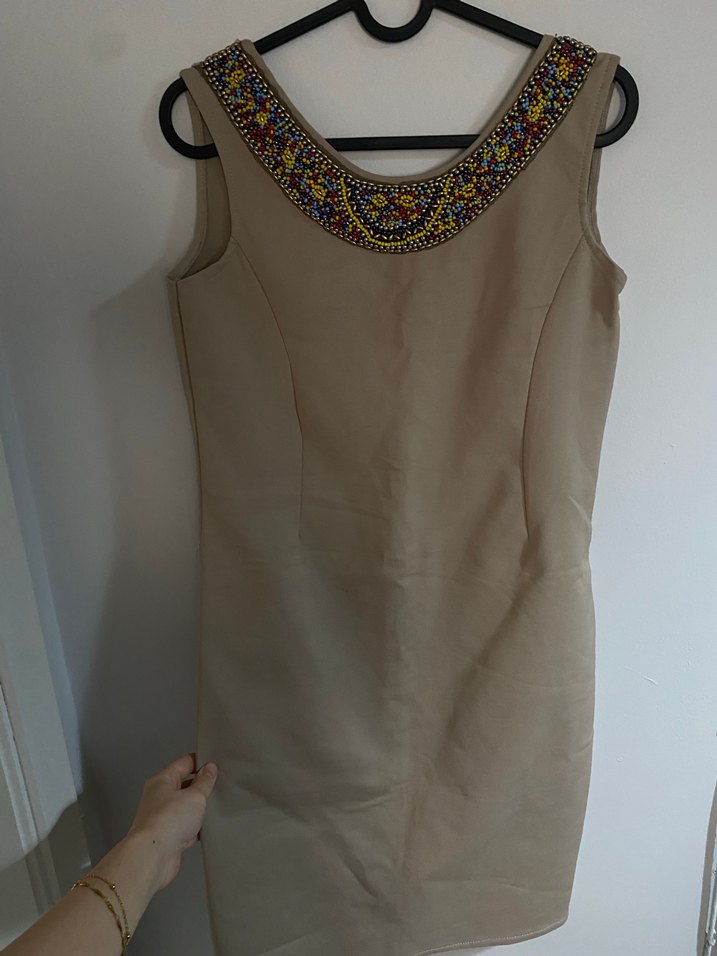 Boncuk İşlemeli Bej Bohem Midi Elbise