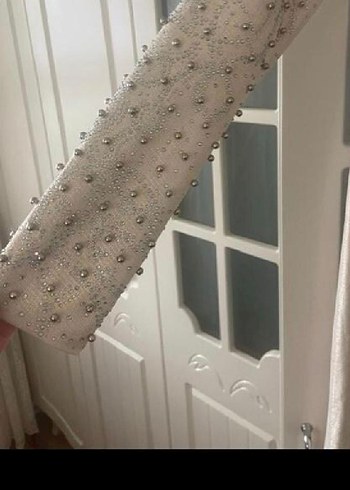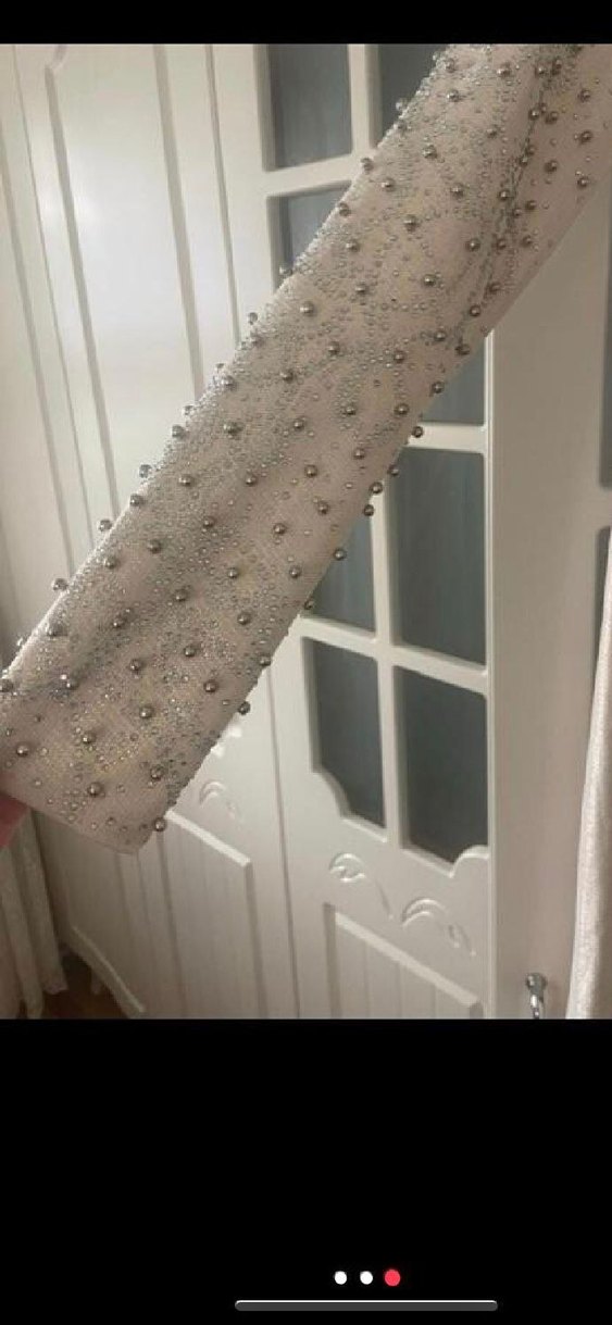 Sentetik kumaştan yapılmış, boncuk işlemeli bej kadın kemeri, çağdaş ve gösterişli bir tarz sunar.