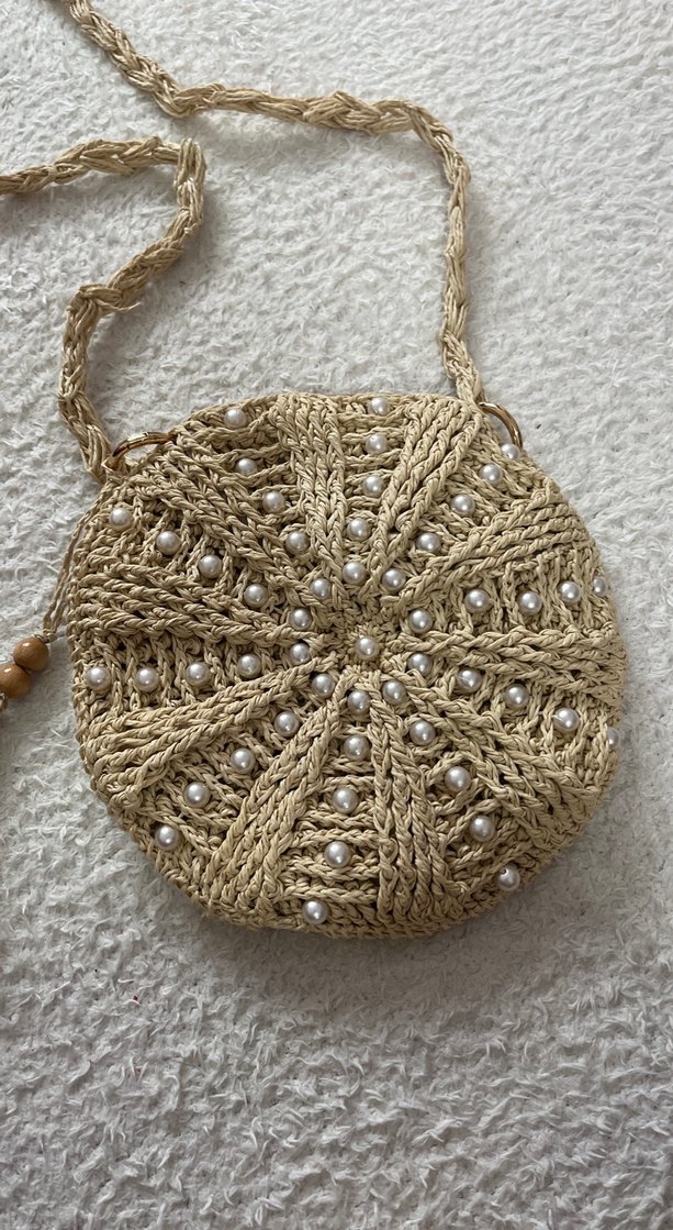 Boncuklarla süslenmiş, bej renkli örgü çapraz çanta. Nakış desenleri ve hafif yapısıyla bohem tarzda günlük kullanıma uygundur. Hasır çanta 2 kez kullandım