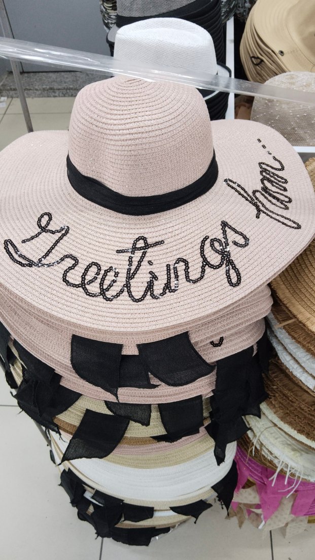 Bej renkli örgü kadın şapka, geniş kenarlı ve parlak boncuk işlemeli 'Greetings from...' yazısına sahip, siyah kurdele detayıyla bohem ve retro tarzı yansıtıyor.
