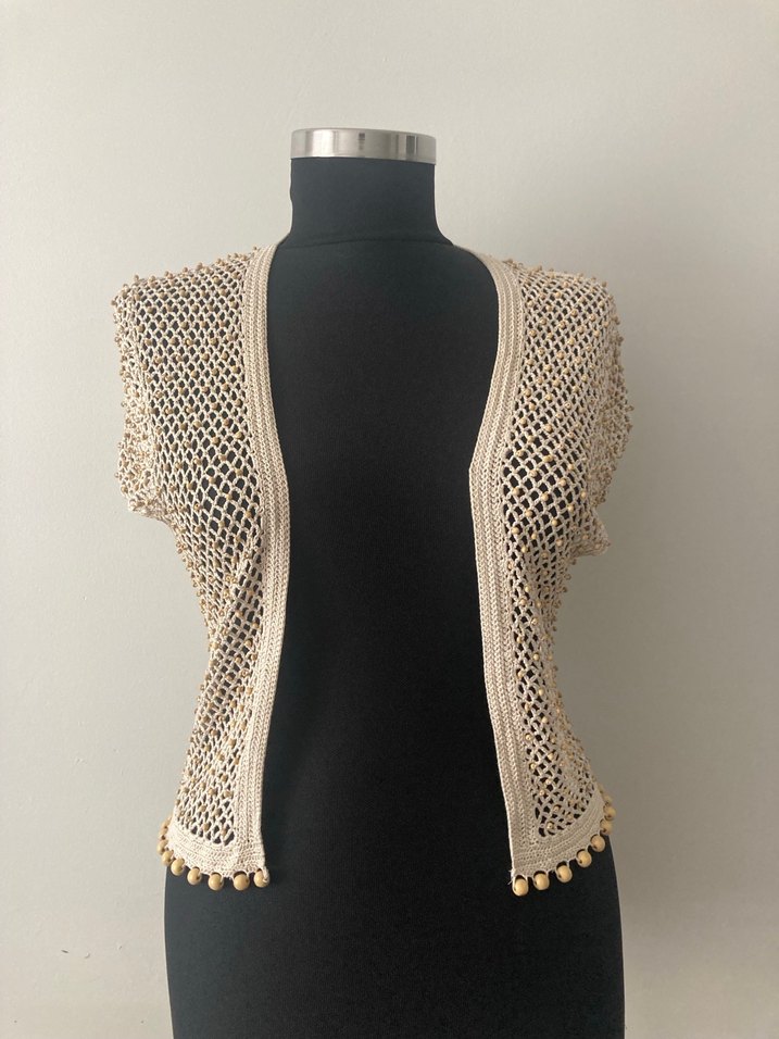 Boncuk İşlemeli Bej Örgü Kadın Yelek