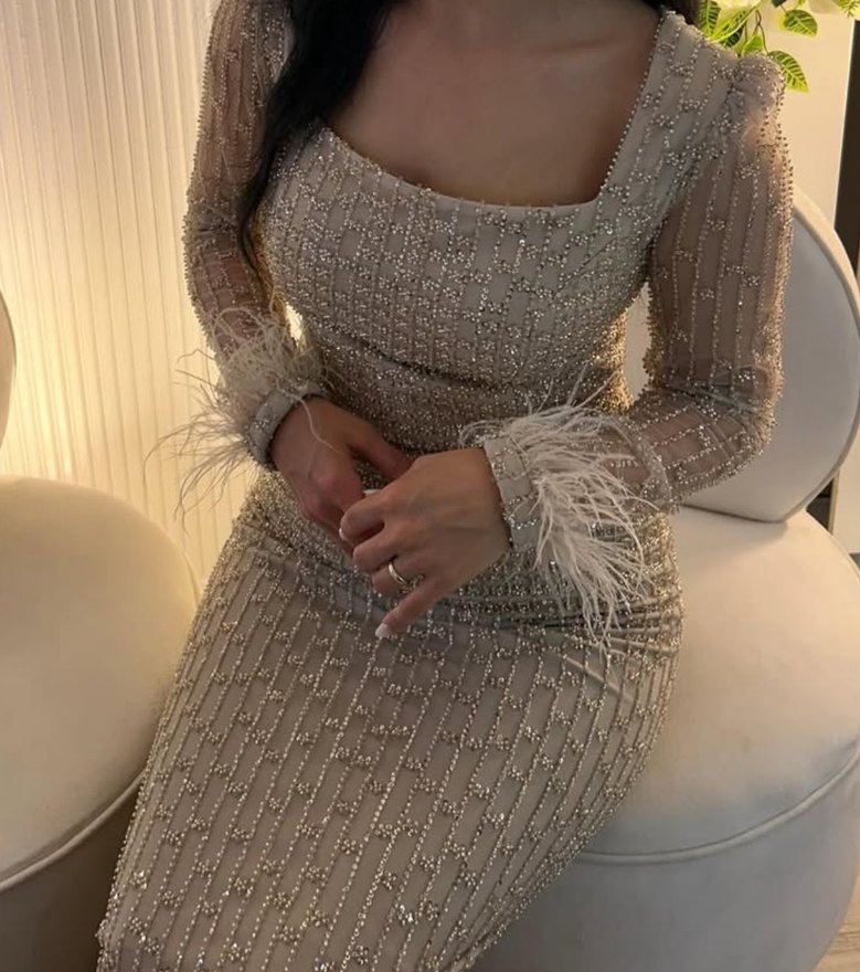 Boncuk işlemeli ve nakış detaylı, uzun kollu, tek vücut oturan bej abiye elbise, klasik ve modern şıklık sunar. ✨ sadece nişanımda giydim temiz kullanıldı 36-38 beden aralığında 54-55 kiloda giydim bej gold tonlarında