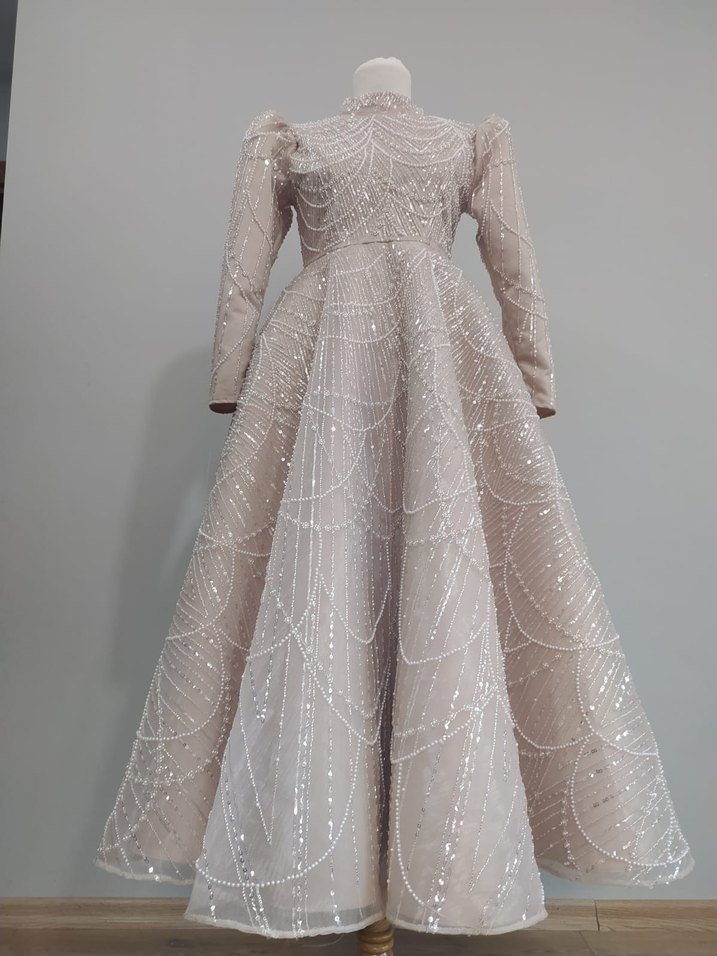 Boncuk İşlemeli Bej Uzun Kollu Nişan Elbisesi