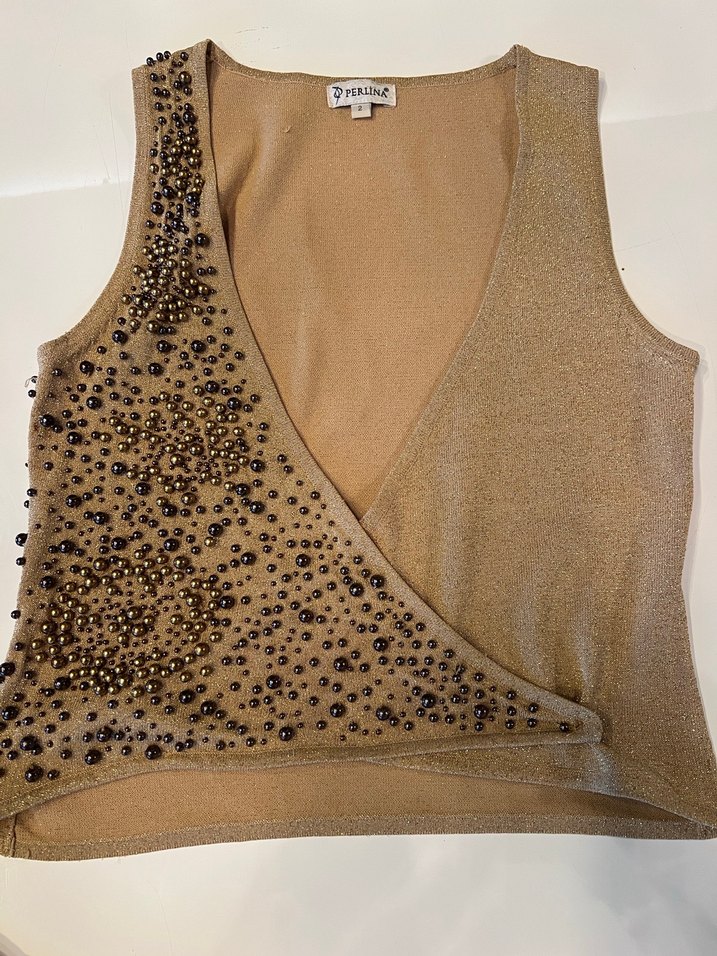 Bej renkli, V yakalı ve kolsuz kadın yelek. Parlak boncuk işlemeleriyle süslenmiş, sentetik kumaştan, dar kesim ve midi boyda. Dış mekan için uygun, sokak modasına uygun.