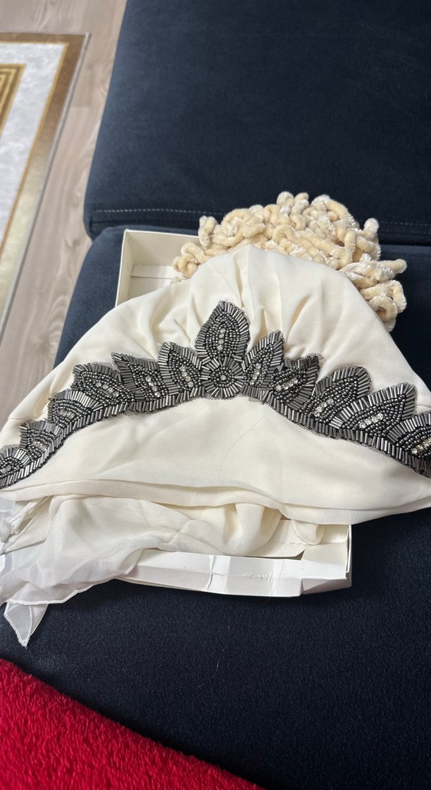 Gri boncuk işlemeli, beyaz renkte bohem tarzda gelin aksesuarı, trend belirleyiciler ve avant-garde moda severler için uygun. Hazır taş işlemeli şal özel günlerinizde kurtarıcı bir parça sadece 1 kez kullanıldı kendisinin topuz tokasıda içinde ayşe tasarım marka oldukça iyi bi marka krem beyaz renginde