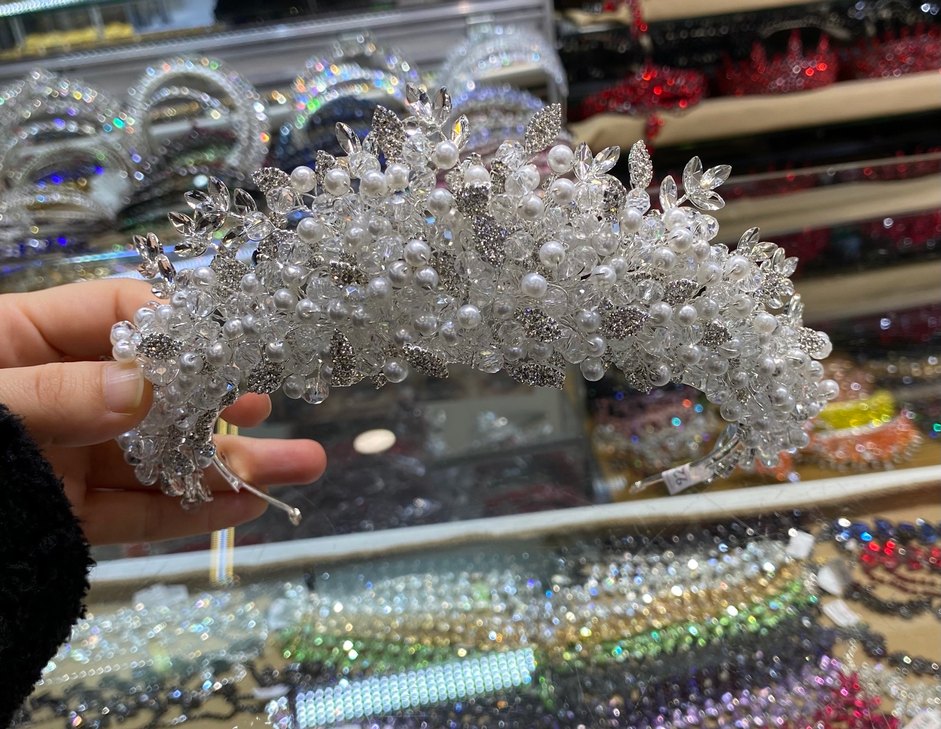 Boncuk ve inci detaylarıyla süslenmiş beyaz bohem gelin tacı, gösterişli ve modaya uygun bir görünüm sunar.