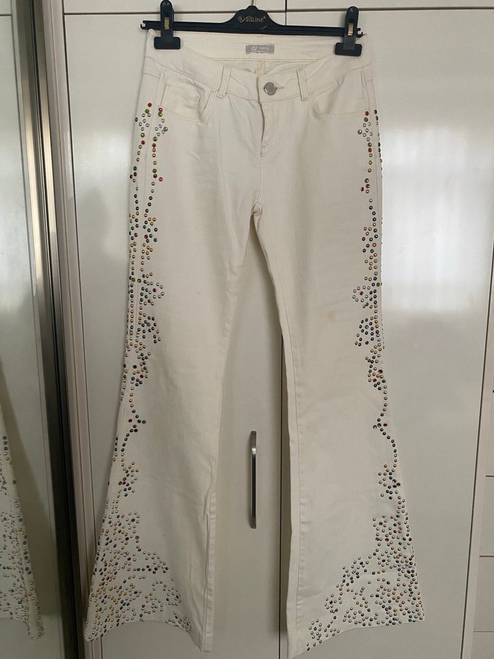 Boncuk ve işlemeli detaylara sahip, bohem tarzda beyaz, bol kesim uzun kadın pantolonu. Yıkanınca çıkıcak, ufak tefek durmaktan lekeler oluşmuş. Uğraşmak istemediğim için Bu yüzden markaya göre fiyatı uygun yazdım. İade yoktur.