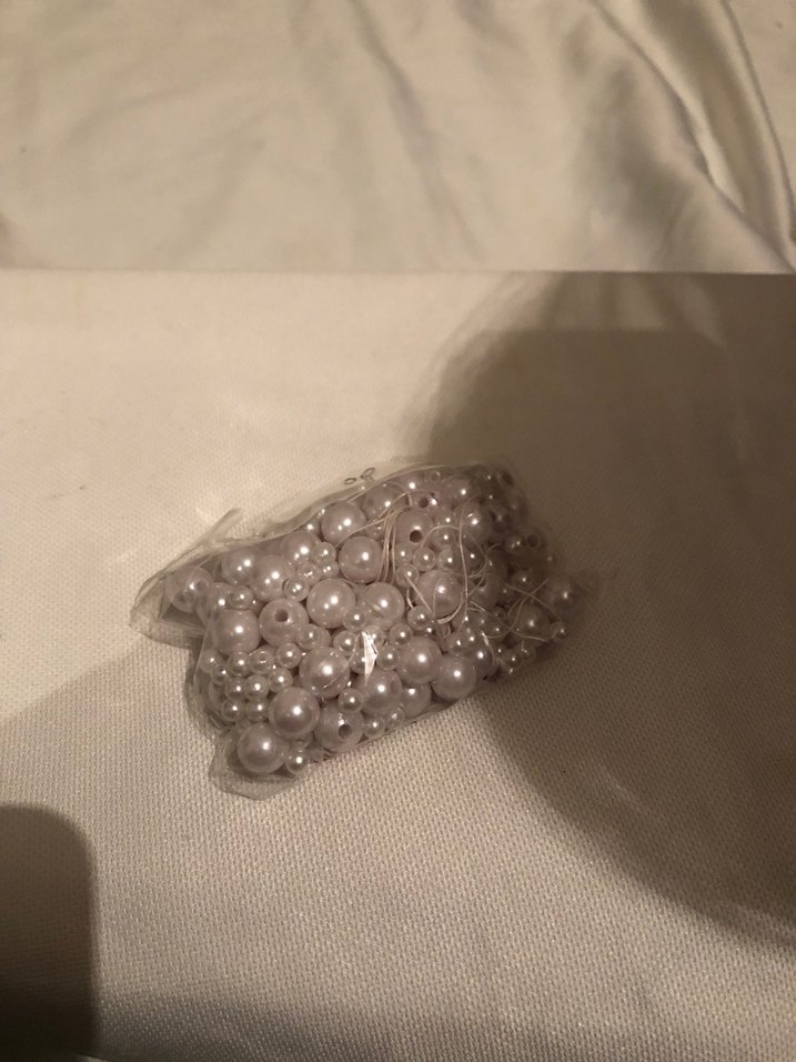Farklı boyutlarda boncuklarla süslenmiş beyaz broş. Parlak yüzeye sahip, düğünler ve gösterişli stiller için uygun.