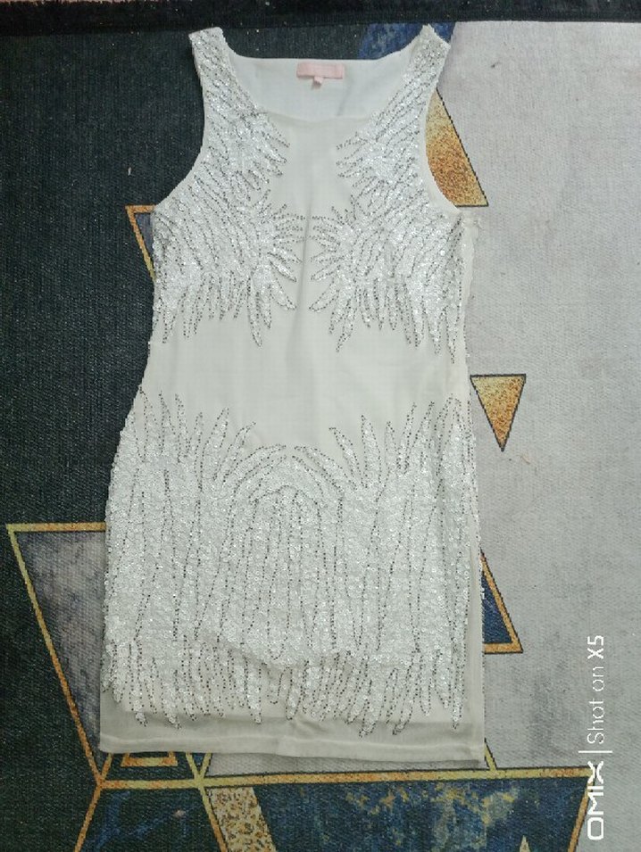Boncuk işlemeli, kolsuz beyaz abiye elbise., vücuda oturan kesimiyle partiler için uygundur. ✨