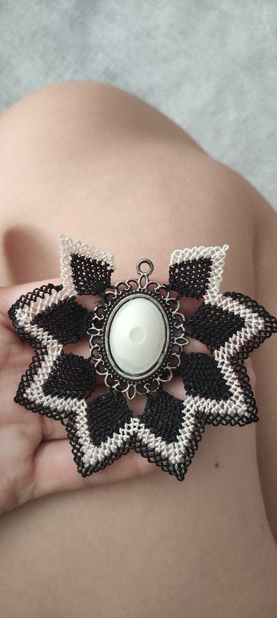 Bohem tarzda, koyu renk boncuk işlemeli, beyaz taş detaylı kadın broş, günlük kullanıma uygun. El emeği ürün.
