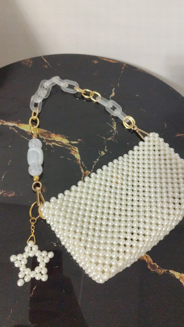 Yıldız şeklinde boncuklu aksesuar ve şeffaf zincir saplı beyaz boncuk işlemeli kadın çantası. Bohem ve şık tarzda, günlük kullanıma uygun.