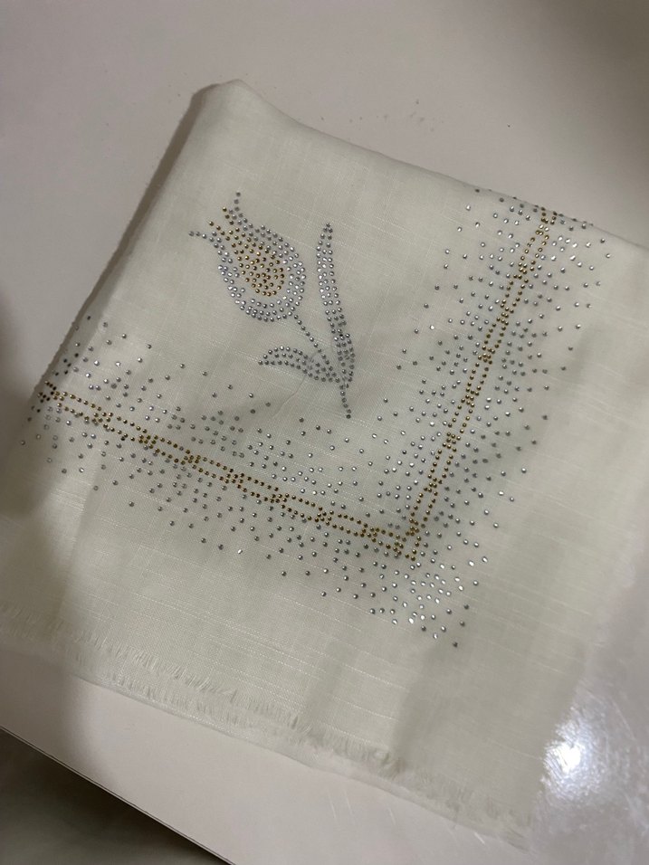 Yumuşak sentetik kumaştan, boncuk işlemeli beyaz kadın şalı, sade ve mütevazı bir tarz sunar.