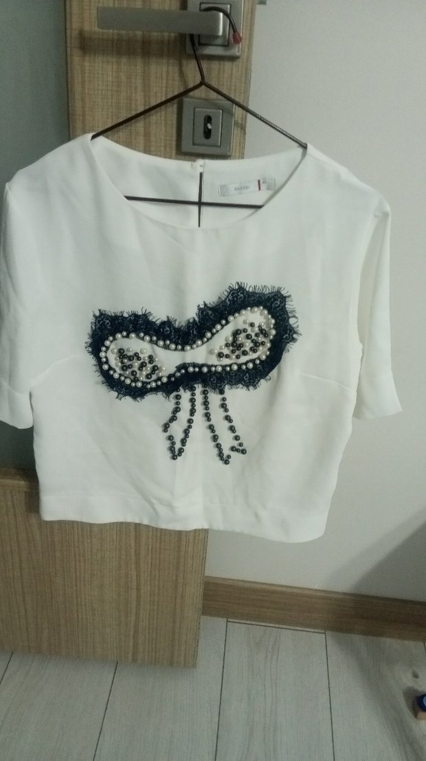 Boncuk İşlemeli Beyaz Kısa Kollu Mini Bluz