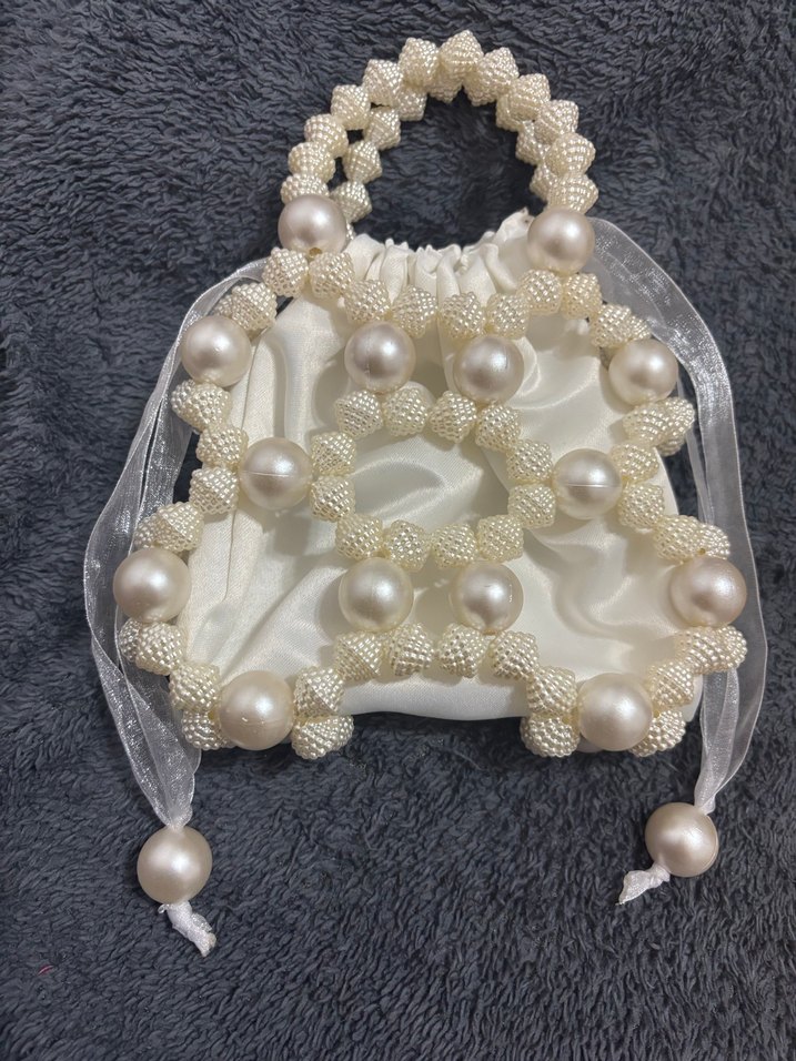 Boncuk işlemeli ve nakışlı desenlere sahip beyaz örgü kadın çantası, kurdeleli kapanış ve inci detaylarıyla düğünler için uygun, bohem Paris tarzında.