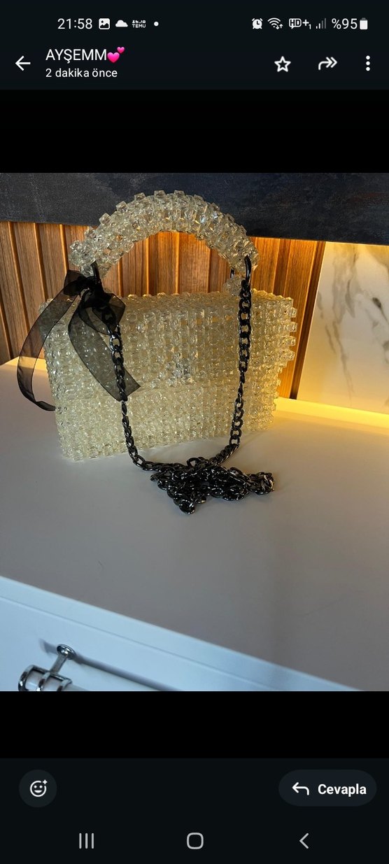 Boncuk işlemeli beyaz örgü kadın çanta, siyah zincir askıyla günlük kullanıma uygun, çağdaş ve Paris tarzı bir tasarım sunar.