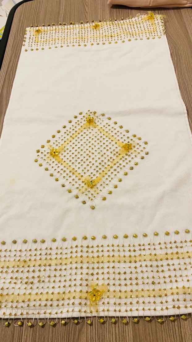 Parlak altın işlemeli detaylara sahip klasik tarzda beyaz yüz havlusu. ✨
