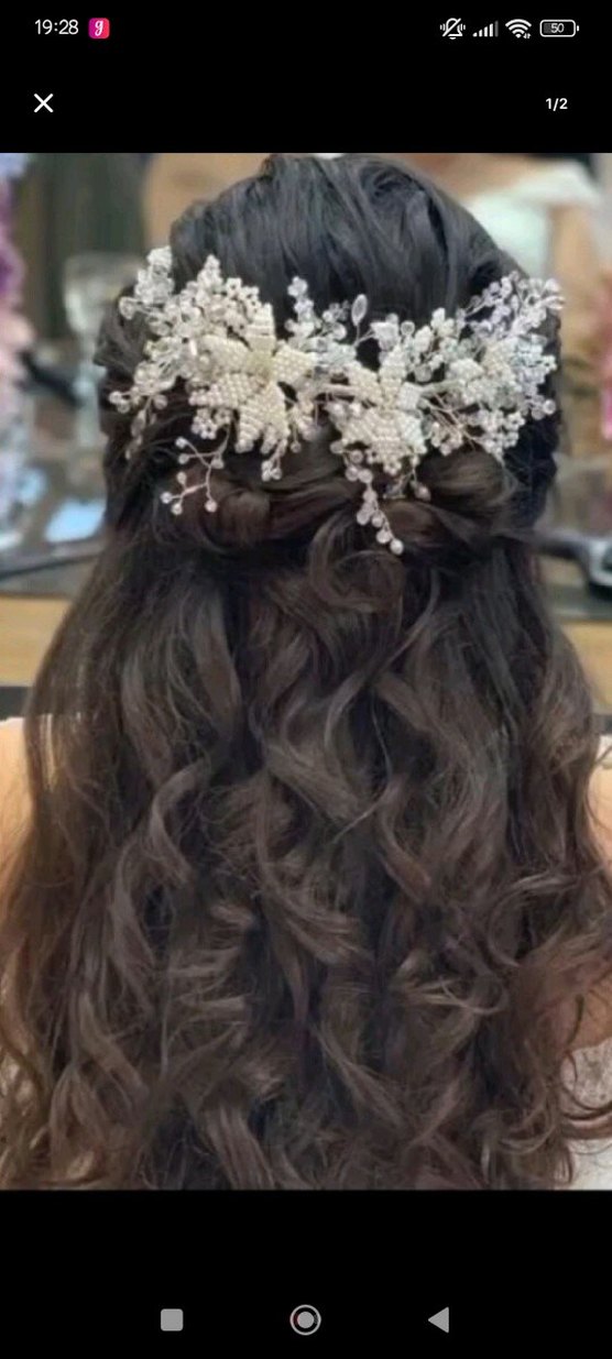 İnce işçilikle hazırlanmış, boncuk işlemeli beyaz saç aksesuarı. saçlara ışıltılı bir dokunuş katar.