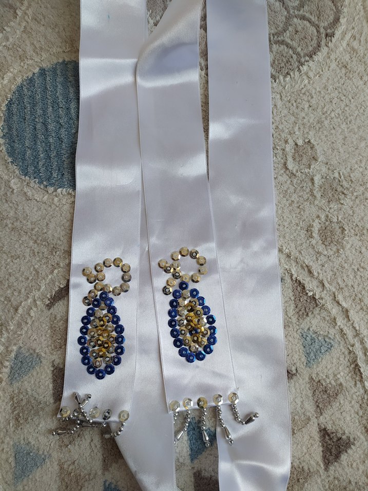Parlak mavi ve altın boncuklarla süslenmiş beyaz saten sunnet kurdelası✨