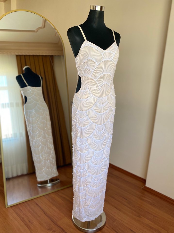 Hiç kullanılmamıştır. Boncuk işlemeli, V yakalı ve ince askılı beyaz uzun abiye elbise. Fitted kesimi ve bohem tarzıyla düğünler için uygun, vintage etkisi taşıyor. ✨
